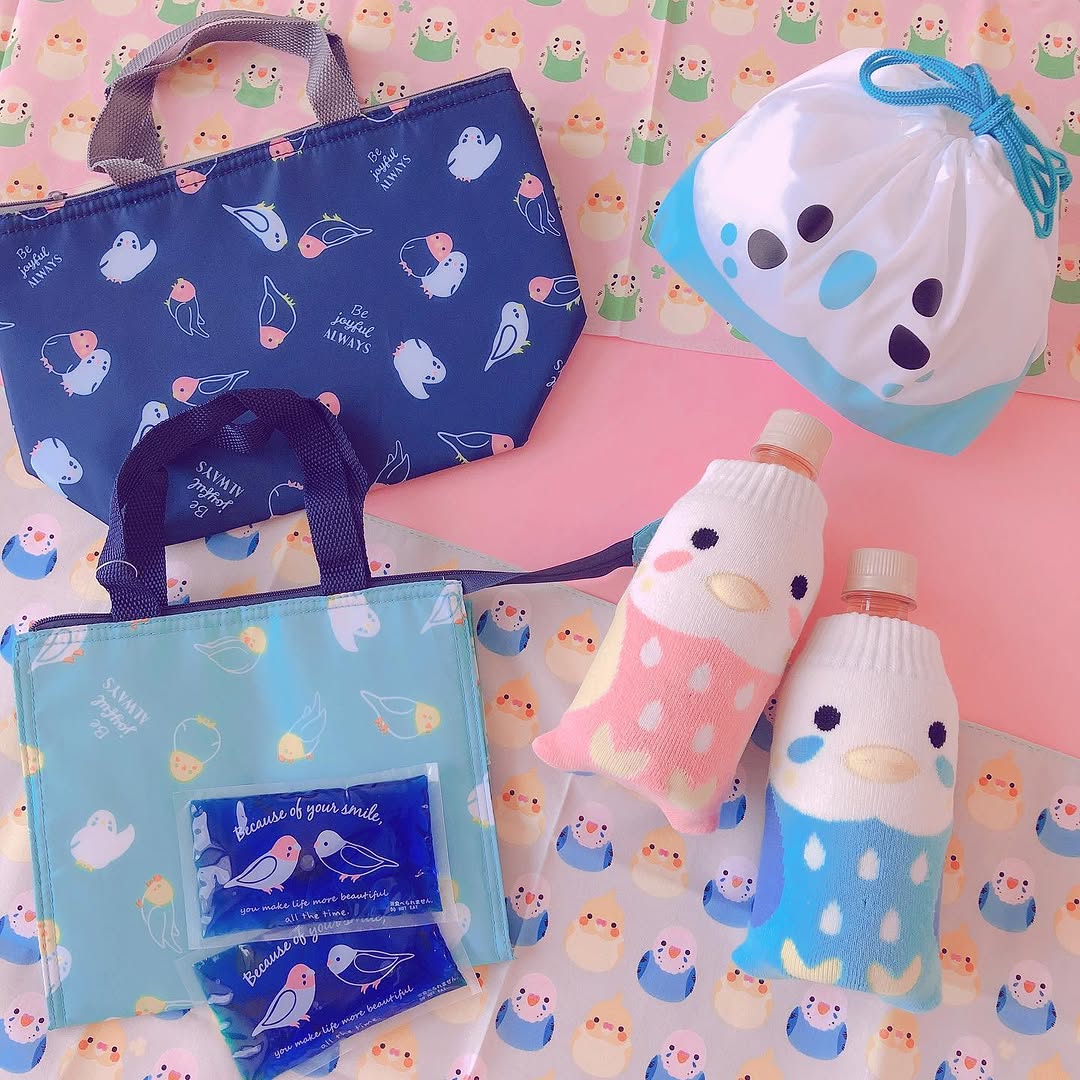 今回の鳥柄シリーズは、お弁当やドリンクを持ち歩く場面で使いやすい雑貨が中心です。アルミ素材のバッグ類は保冷を意識したつくりに見え、ランチ巾着はお弁当箱の持ち運びに向いています。さらに、ボトルカバーや保冷剤もあるので、同じ柄でそろえやすい点がうれしいところです。