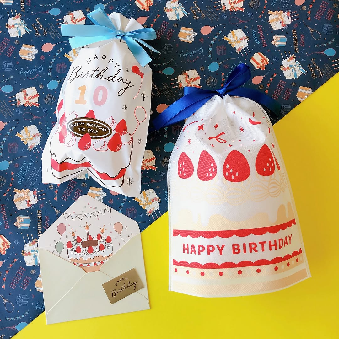 今回のアイテムは、誕生日向けのラッピングやメッセージカードをそろえたシリーズです。華やかなデザインで、プレゼントを包むだけでなく、渡す瞬間の見た目も整えやすいのが特徴です。特にポリ巾着バッグは、付属シールで年齢や日付をデコレーションできるため、毎年の記念日を少し違った形で演出しやすくなっています。