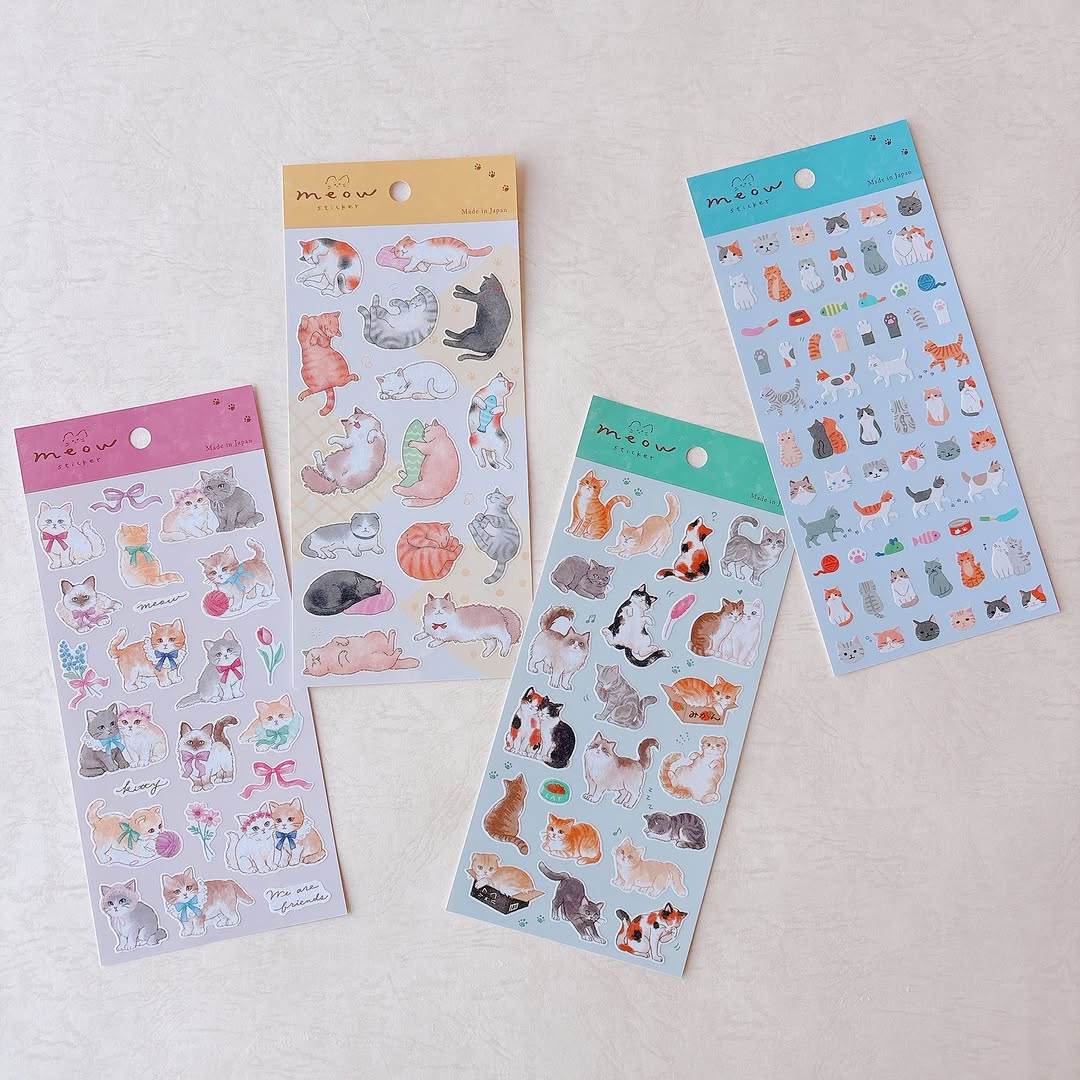 「meow sticker」は、さまざまな猫の姿をテーマにしたシールシリーズです。おひるね中の姿や、のんびりした表情、おめかしした猫など、それぞれ違った雰囲気が楽しめるのが特徴。1枚のシートに複数のデザインが入っているため、用途に合わせて使い分けやすいのも魅力です。