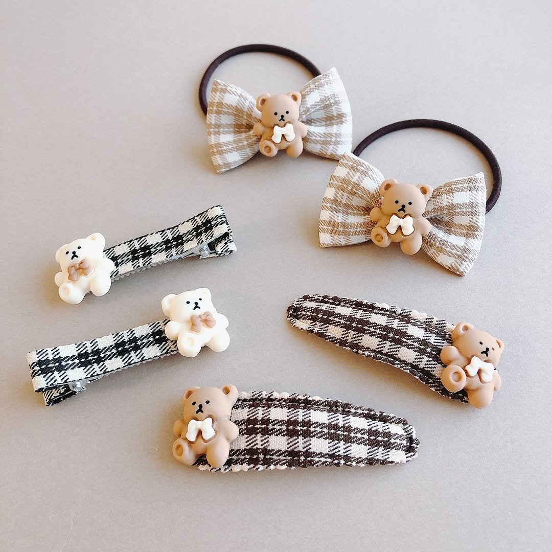 ブラウンやベージュを基調にしたチェック柄と、小さなくまのデザインが特徴のヘアアクセサリーシリーズです。甘すぎない色合いなので、子どもっぽくなりすぎず、普段のコーデにも自然に馴染みます。