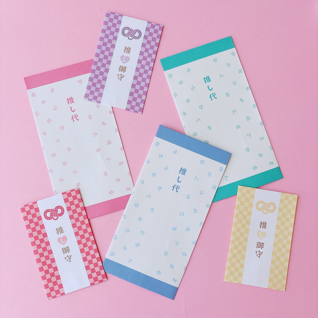 今回のアイテムは、いわゆる“推し活向け”にデザインされた小さめ封筒。お守り風のぷち袋と、推し代(おこづかい)を入れる万型封筒の2タイプがあります。どちらもカラーバリエーションがあり、推しカラーで選べるのが特徴です。