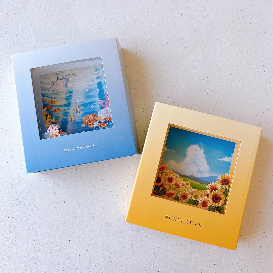 この商品は、パーツを組み立てて立体的に飾れるディスプレイ雑貨です。夏をテーマにしたデザインが特徴で、アクアリウムとひまわりの2種類が展開されています。奥行きのある構造で、平面の飾りとは違い、ミニチュアの世界観を楽しめるのが魅力です。