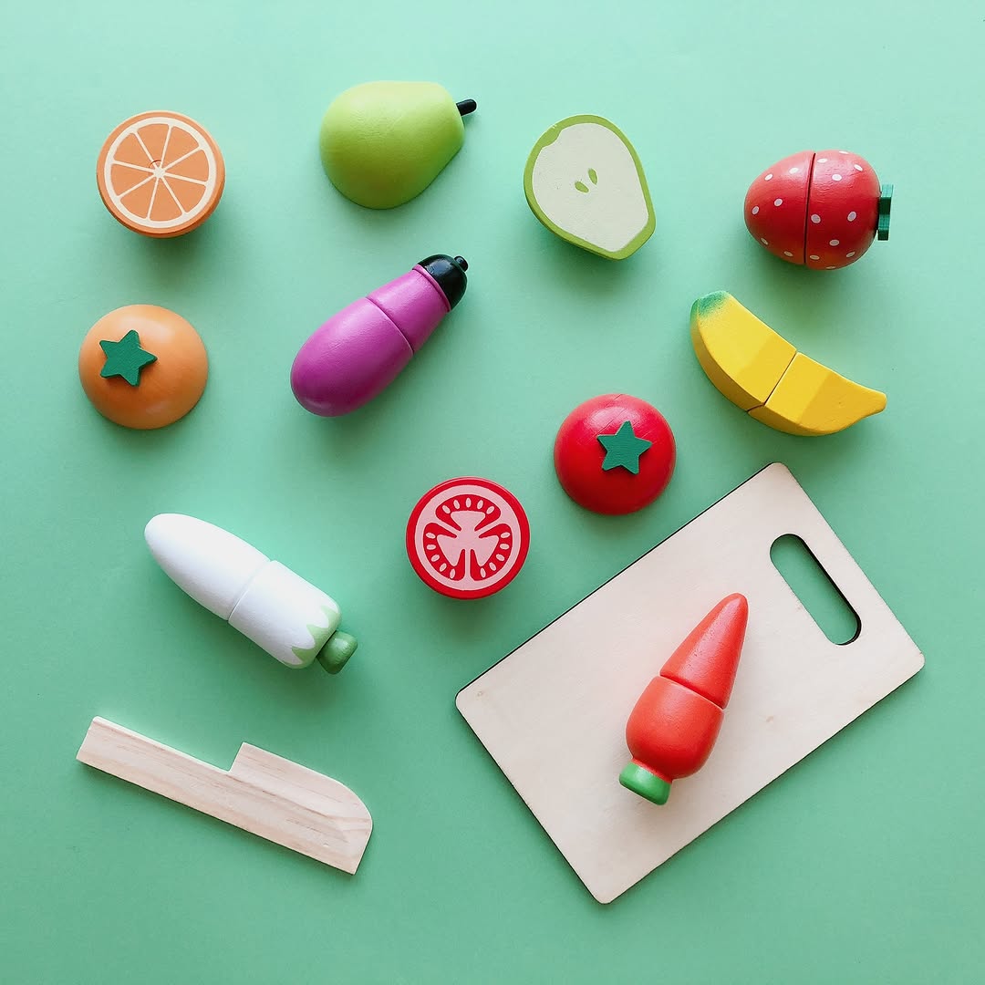 ラインナップも豊富で、食材だけでなく包丁とまな板まで揃うため、これだけで一通りのおままごと遊びが成立します。
