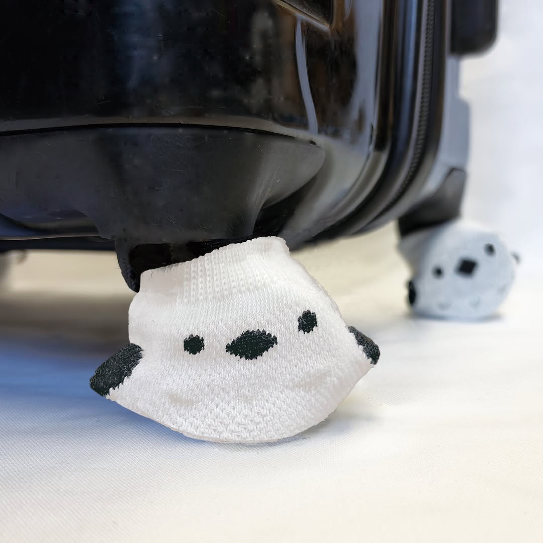 キャンドゥのキャスターカバーは、キャリーケースのタイヤに履かせるだけで汚れ対策や床保護に役立つ可能性のあるアイテムです。さらにシマエナガや猫などのかわいいデザインが揃っており、旅行グッズのアクセントにもなります。