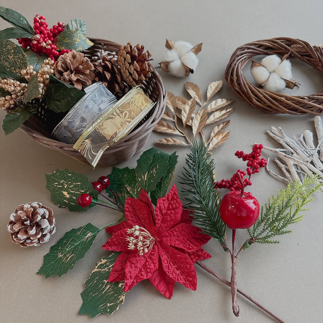 今回のラインナップは、リース作りに必要なパーツが一通りそろうのが特徴です。グリーン系のアートリーフやポインセチア、ユーカリなどの造花に加え、松かさやコットンといったドライパーツも用意されています。さらに、土台となるリース本体やリボンもあるため、別途材料を探し回る手間が少ないのがうれしいポイントです。