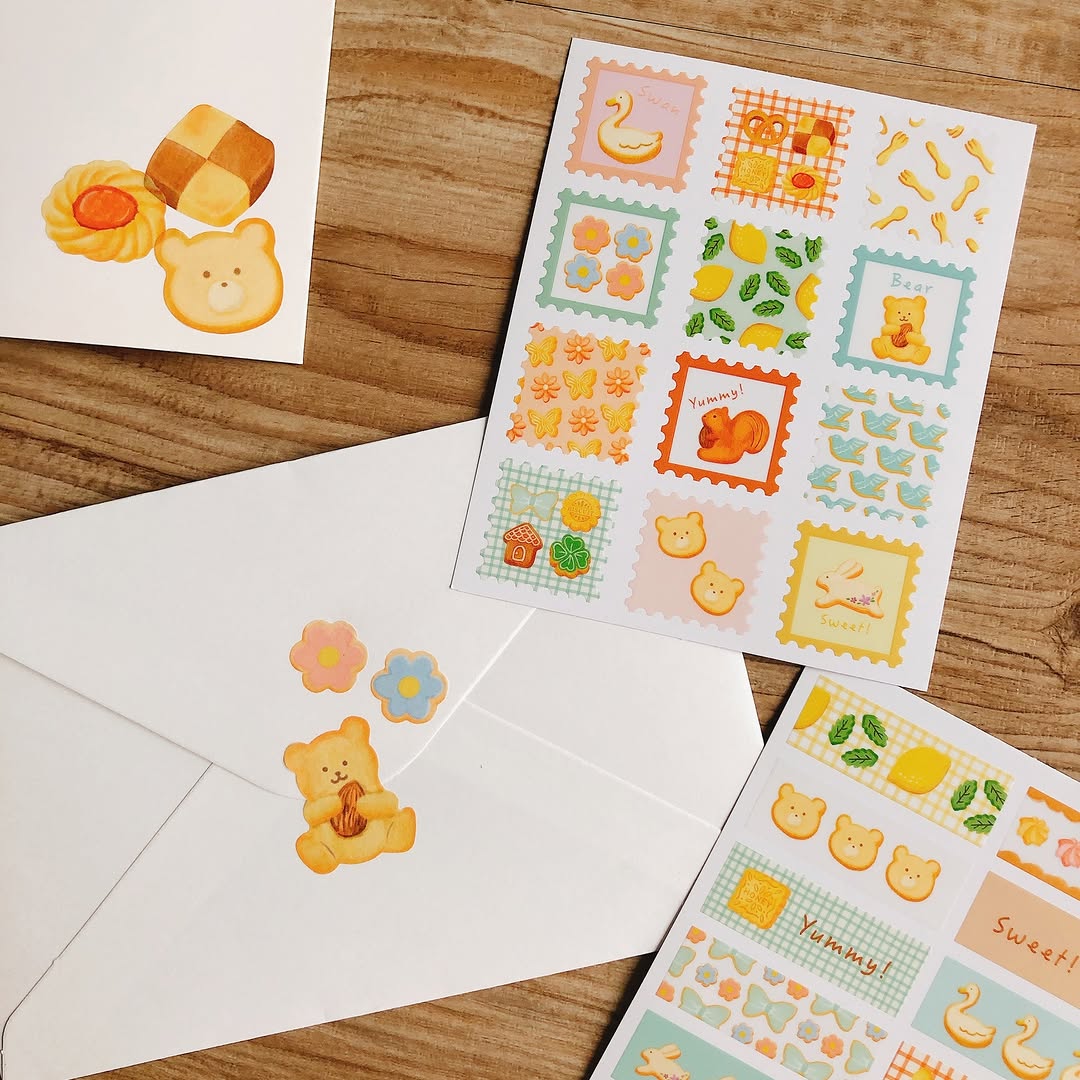焼き菓子をイメージした、やさしい色味と形が特徴のデザインシールです。丸やハートなどのクッキー風モチーフが中心で、ナチュラルテイストの雑貨や手帳とも相性がよい印象です。