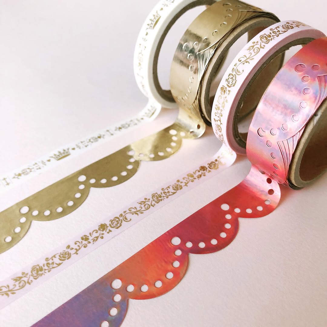 今回のアイテムは、装飾向きのテープ2種です。どちらも紙ものやラッピングに合わせやすく、貼るだけで印象を変えやすいのが特徴です。マスキングテープタイプは扱いやすさがあり、メタリックテープは光沢感でアクセントをつけやすいので、用途に応じて選び分けると便利です。