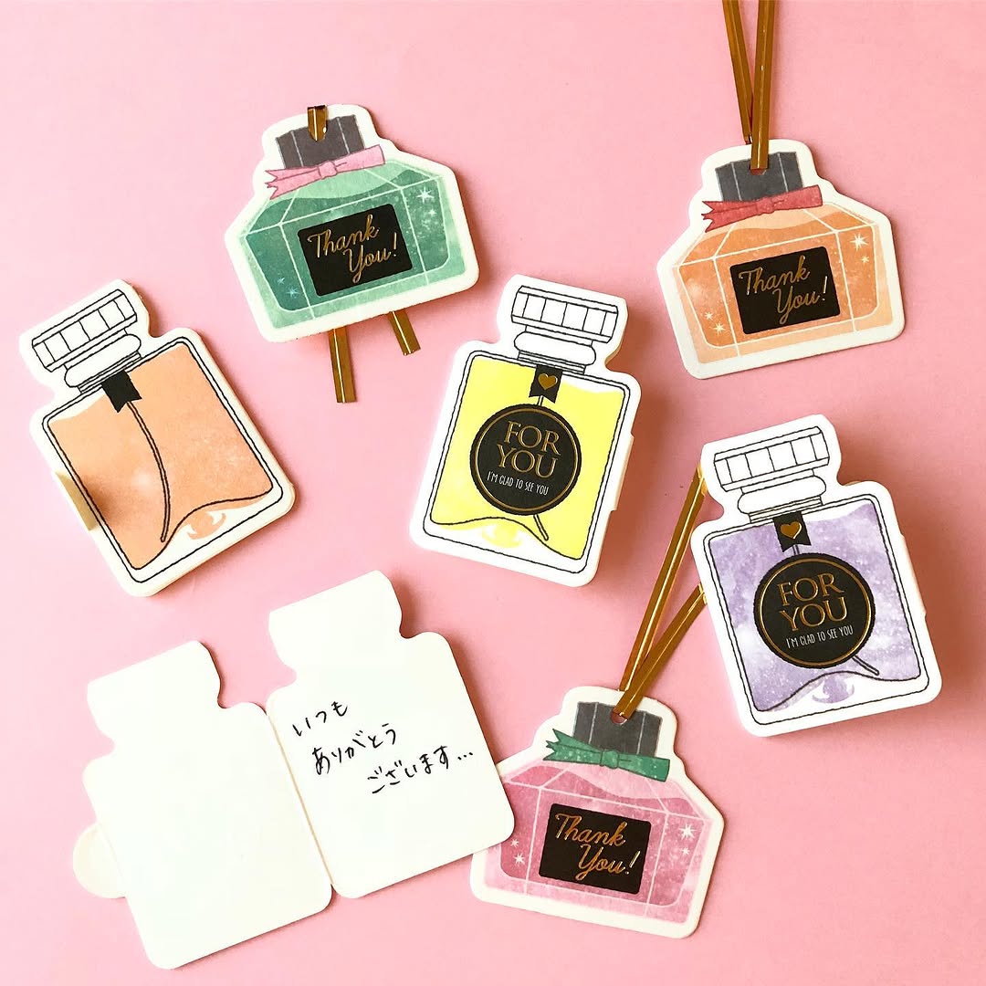 この手の香水柄デザインは、贈り物にひと工夫を加えたい人に向いています。特に、手書きのメッセージが苦手でも、タグやカードがあるだけで気持ちを伝えやすくなるのが魅力です。
