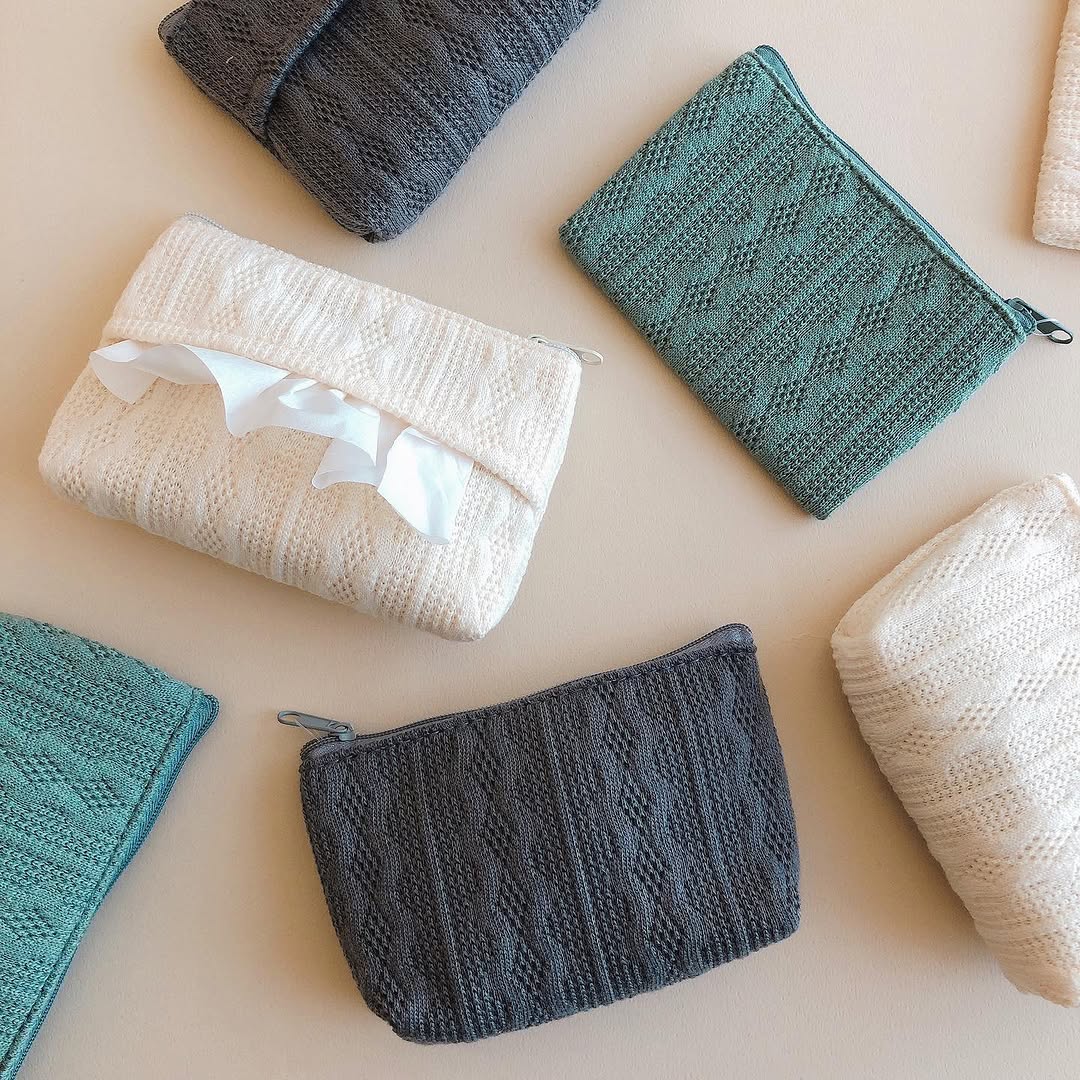 くすみニット柄シリーズは、入れるものを決めておくと使いやすくなります。たとえば、舟形ポーチは「外出時の化粧直しセット」、ポケティポーチは「ティッシュ+リップ+ミニハンドクリーム」、コインケースは「小銭+交通系カードの予備用」など、役割を分けるとバッグの中がすっきりします。