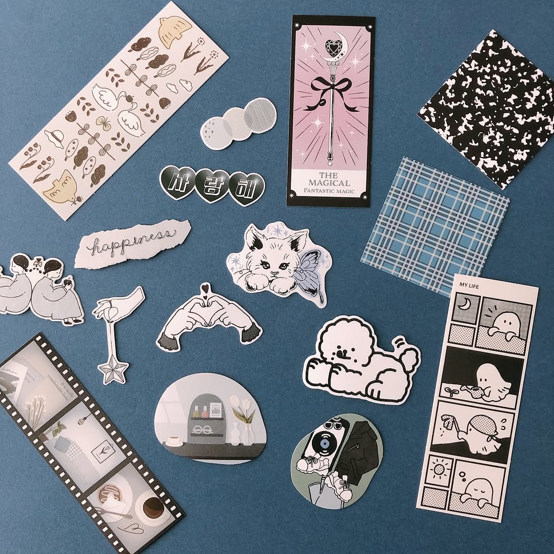 今回のモノトーンシールは、色味を抑えた落ち着いたデザインが特徴。白・黒・グレーを基調としたシンプルな配色で、どんなアイテムにもなじみやすいのが魅力です。