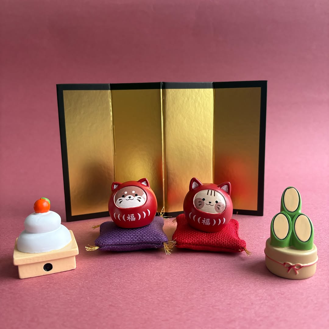 ミニ金屏風+座布団+だるま、または鏡餅を組み合わせるだけで、一気に「お正月らしさ」が出ます。背景・土台・主役の3点を意識すると、まとまりやすくなります。