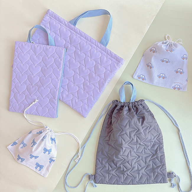 例えば巾着袋は、給食袋や体操服入れ、小物整理に活躍します。キルトバッグはレッスンバッグや上履き入れとして定番で、通園・通学の毎日に欠かせない存在です。