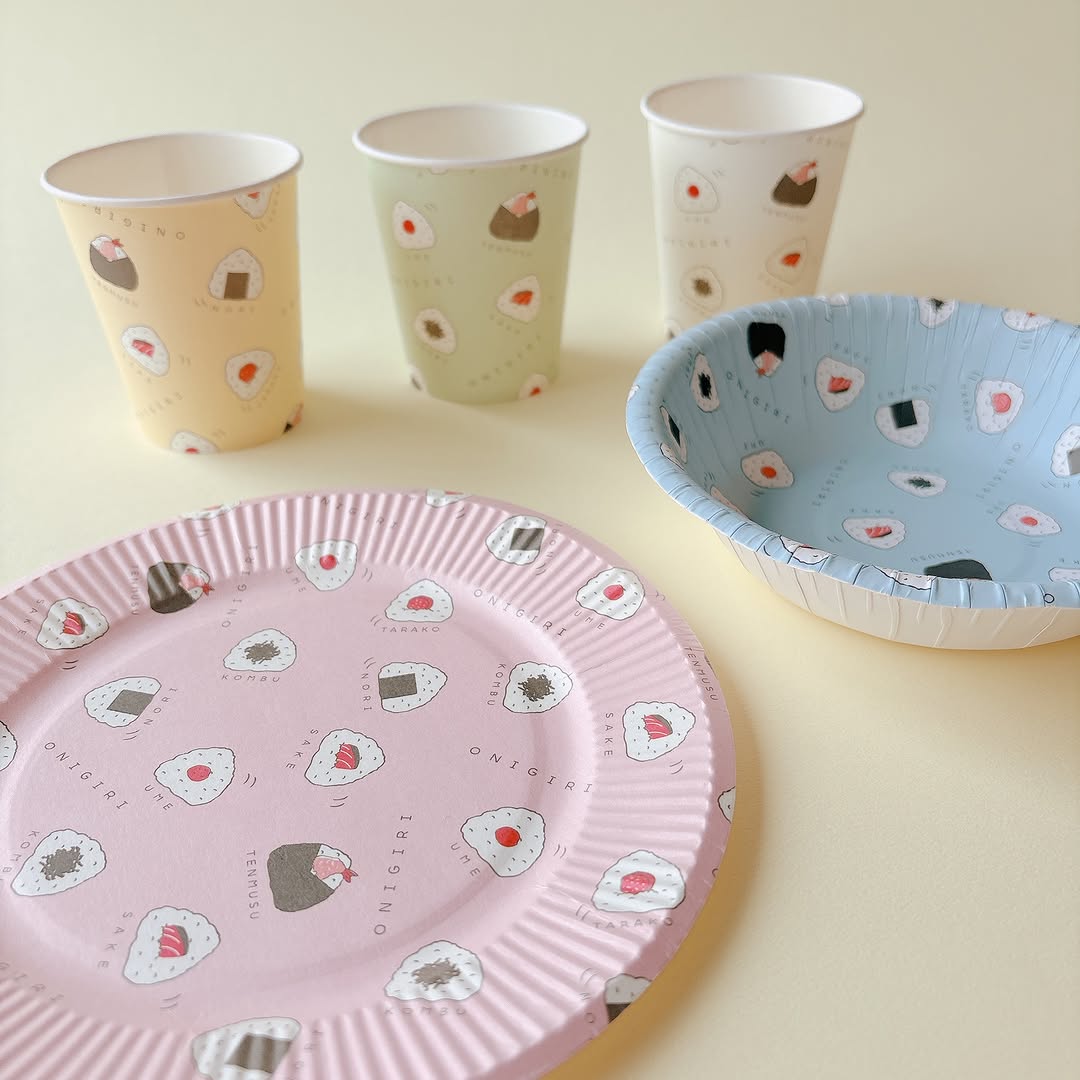 今回登場しているのは、和テイストのおにぎり柄があしらわれた使い捨て食器。紙コップ・プレート・ボウルの3種類がラインナップされており、用途に応じて使い分けできます。軽くて扱いやすく、後片付けもラクなのが特徴です。