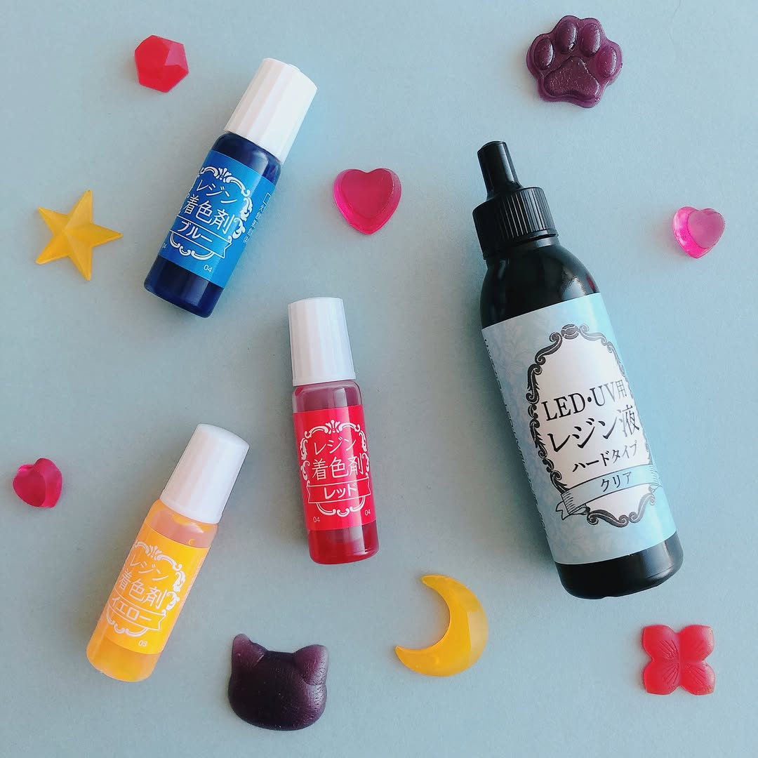 今回紹介するのは、UVライトや太陽光で硬化する「UVレジン液」と、色付けに使える着色剤です。透明なレジン液にカラーを混ぜることで、自分好みの色やデザインを作れるのが特徴です。