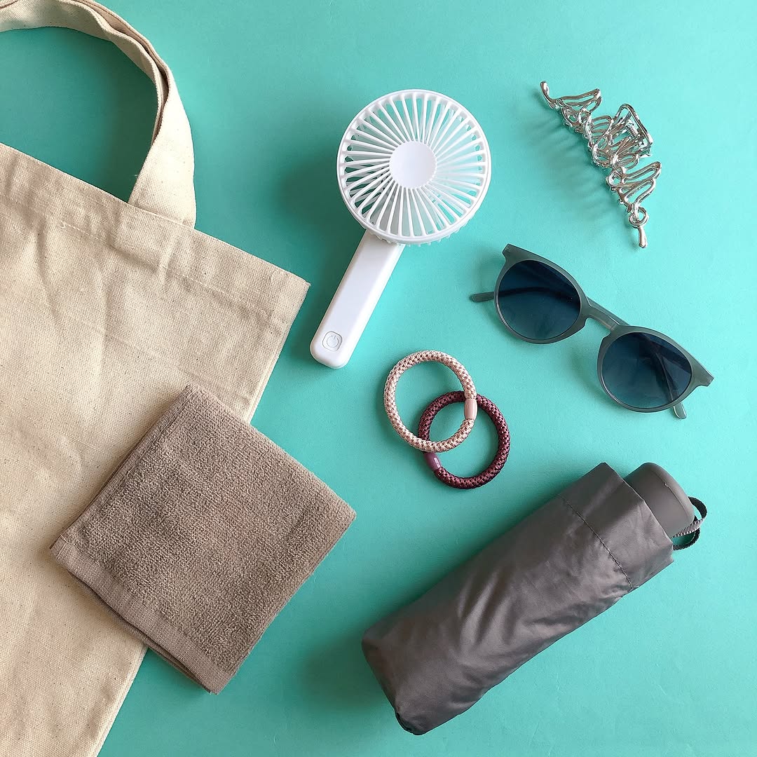 ハンディファンは駅のホームや徒歩移動中に活躍。折りたたみ傘は日傘としても使えるタイプであれば、直射日光を避けるのに便利です。サングラスと組み合わせることで、目元の疲れ軽減にもつながります。