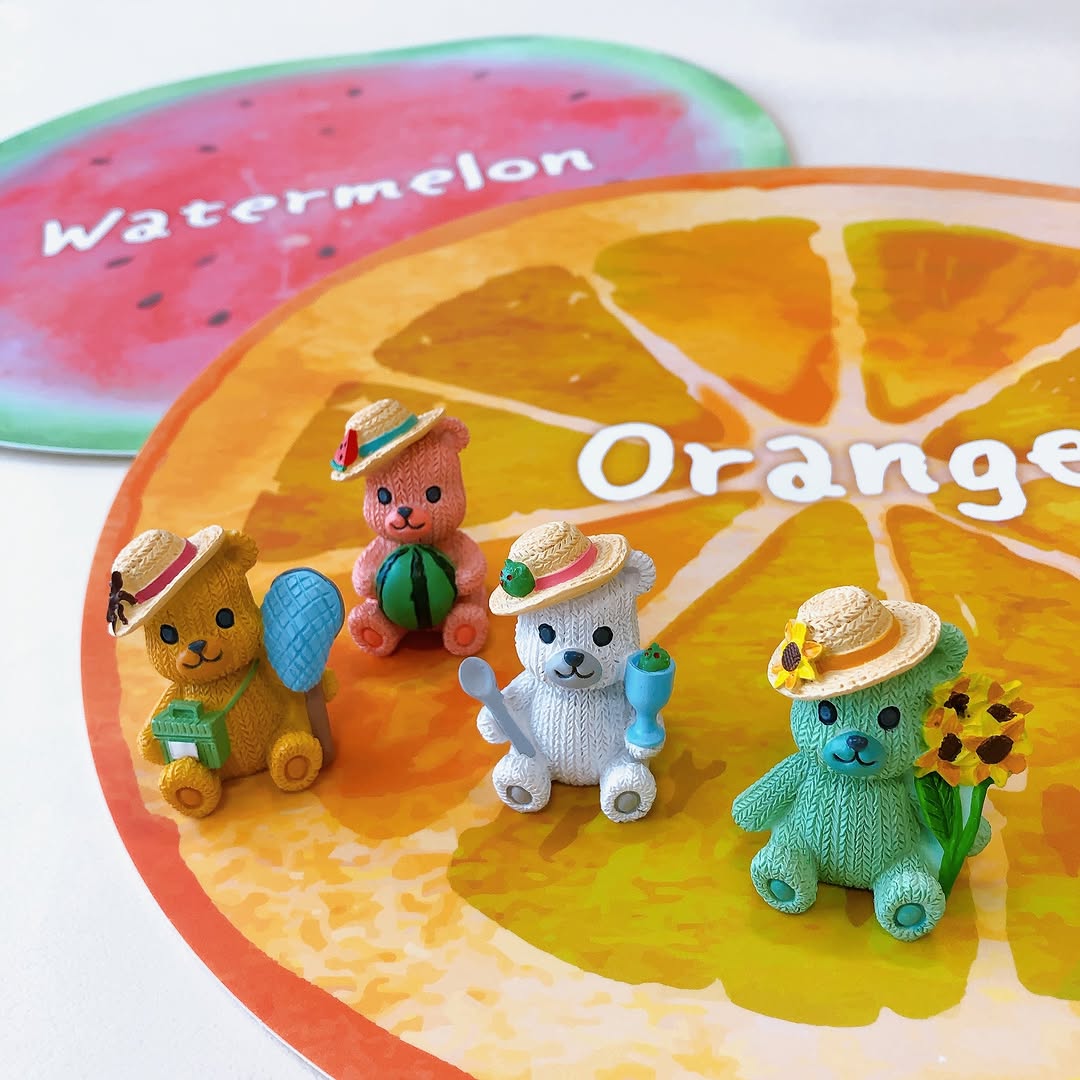今回のアイテムは、フルーツ柄のマットと小さなベアのオブジェという組み合わせ。オレンジやスイカのモチーフが視覚的に涼しさを感じさせ、そこにちょこんと乗るベアがアクセントになります。