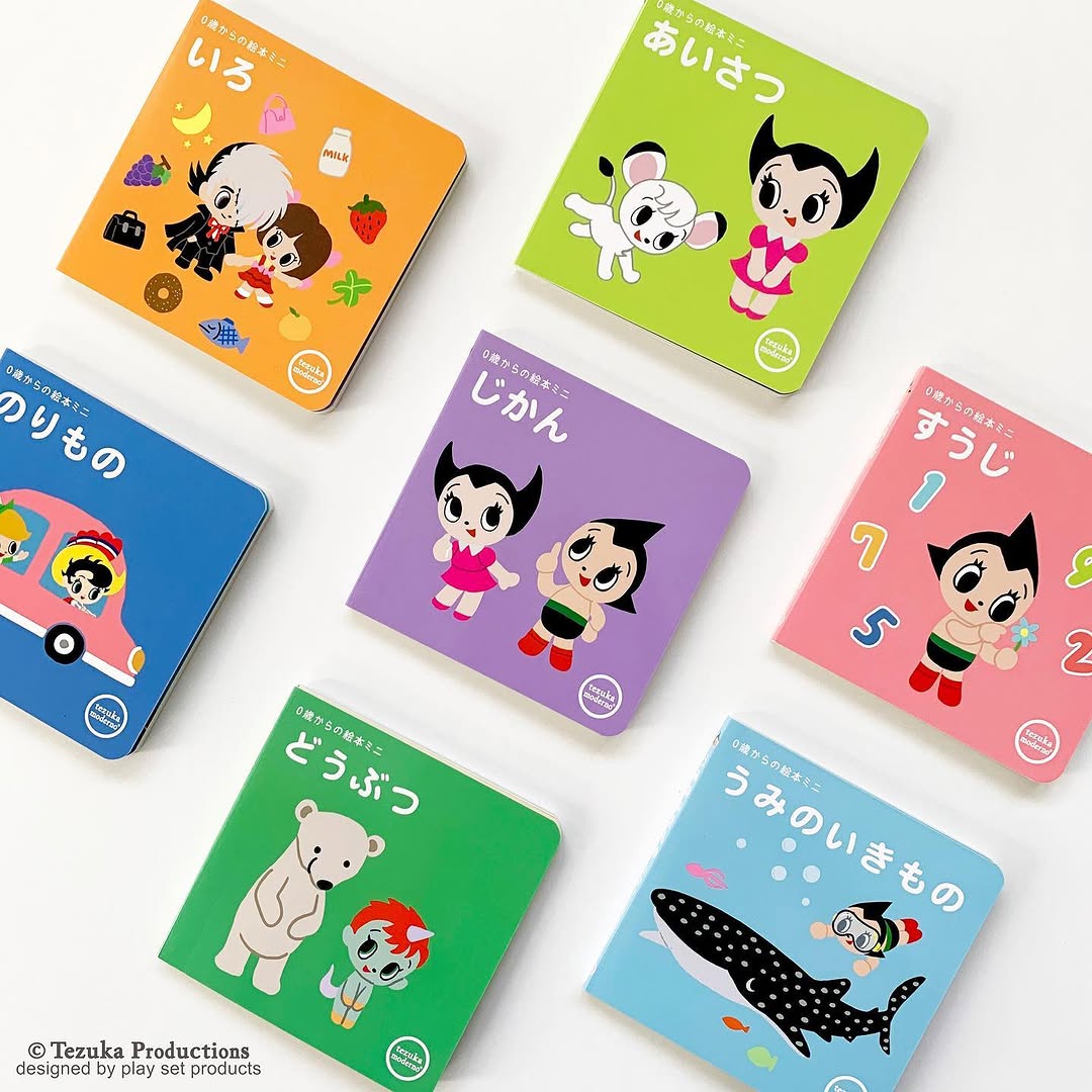 今回紹介するのは、手塚治虫作品の世界観をベースにした「#テヅカモデルノ」シリーズのミニ絵本です。captionによると、以前から人気のあったシリーズがリニューアルして再登場したとのこと。ラインアップは、あいさつ・いろ・すうじ・じかん・のりもの・どうぶつ・うみのいきものの7種類です。