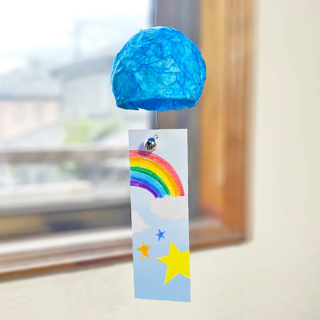 紙素材の風鈴を自分で組み立てて楽しめる工作キットです。特徴は、短冊部分に紫外線で色が変わる仕掛けがあること。屋内では控えめな色合いでも、外に出して日光に当てると変化が見えるため、飾るだけでなくちょっとした実験感覚も味わえます。